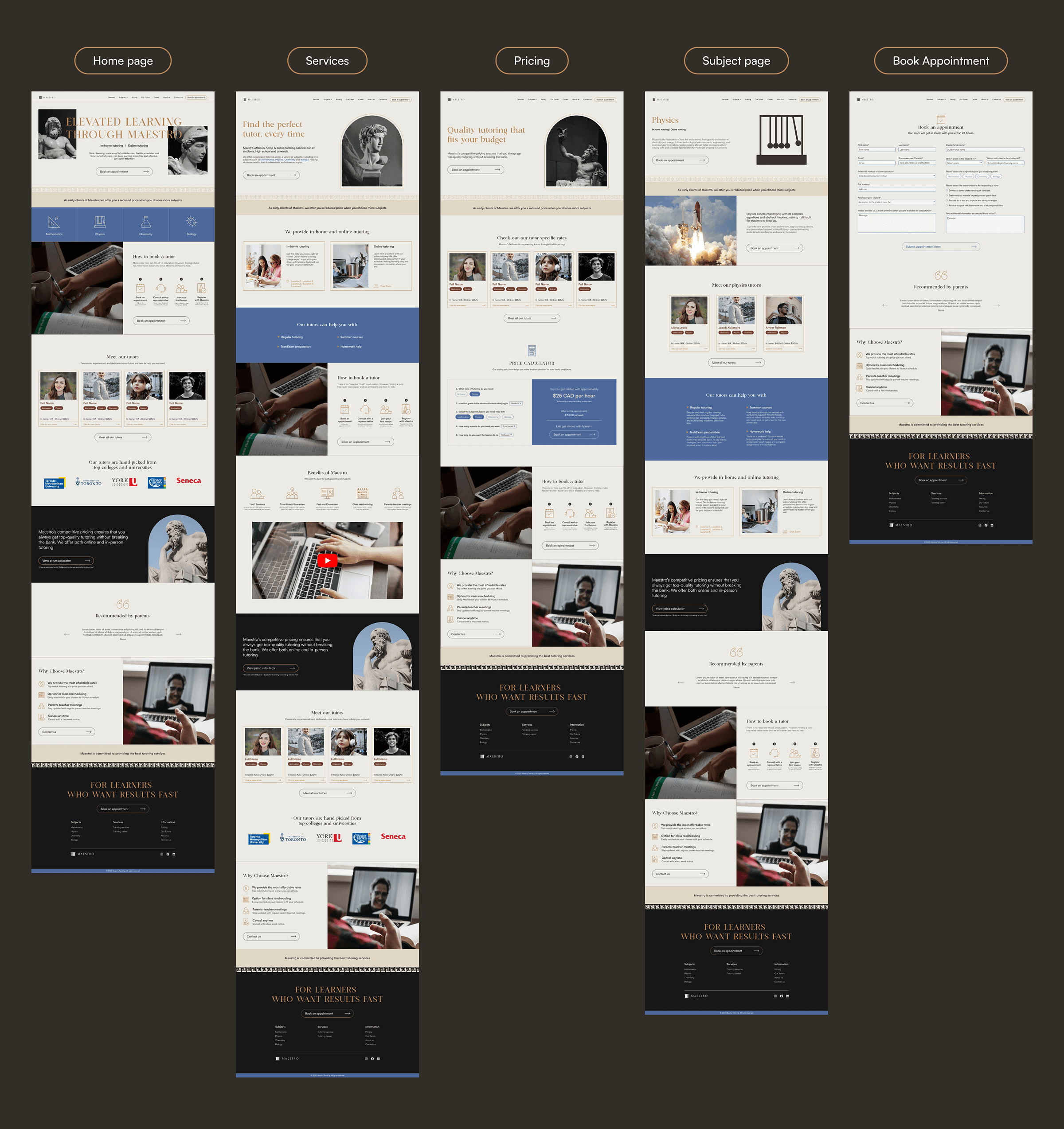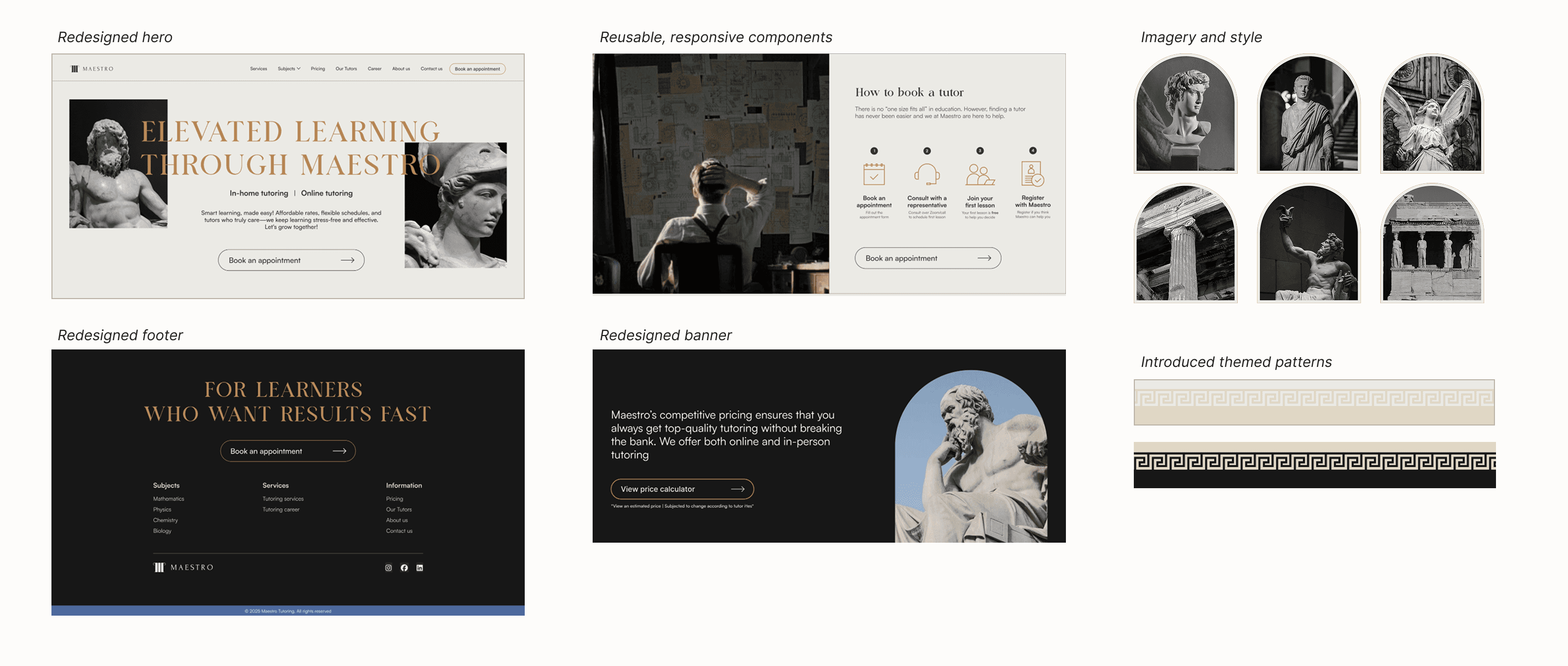 The final UI brings together clearer hierarchy, more polished visual theme, and consistent component system. Key information like pricing, subjects, and testimonials is easier to scan, while the refined Ancient Greek theme adds personality without overwhelming the experience. The result is a clean, trustworthy interface that supports parents in making confident decisions.
